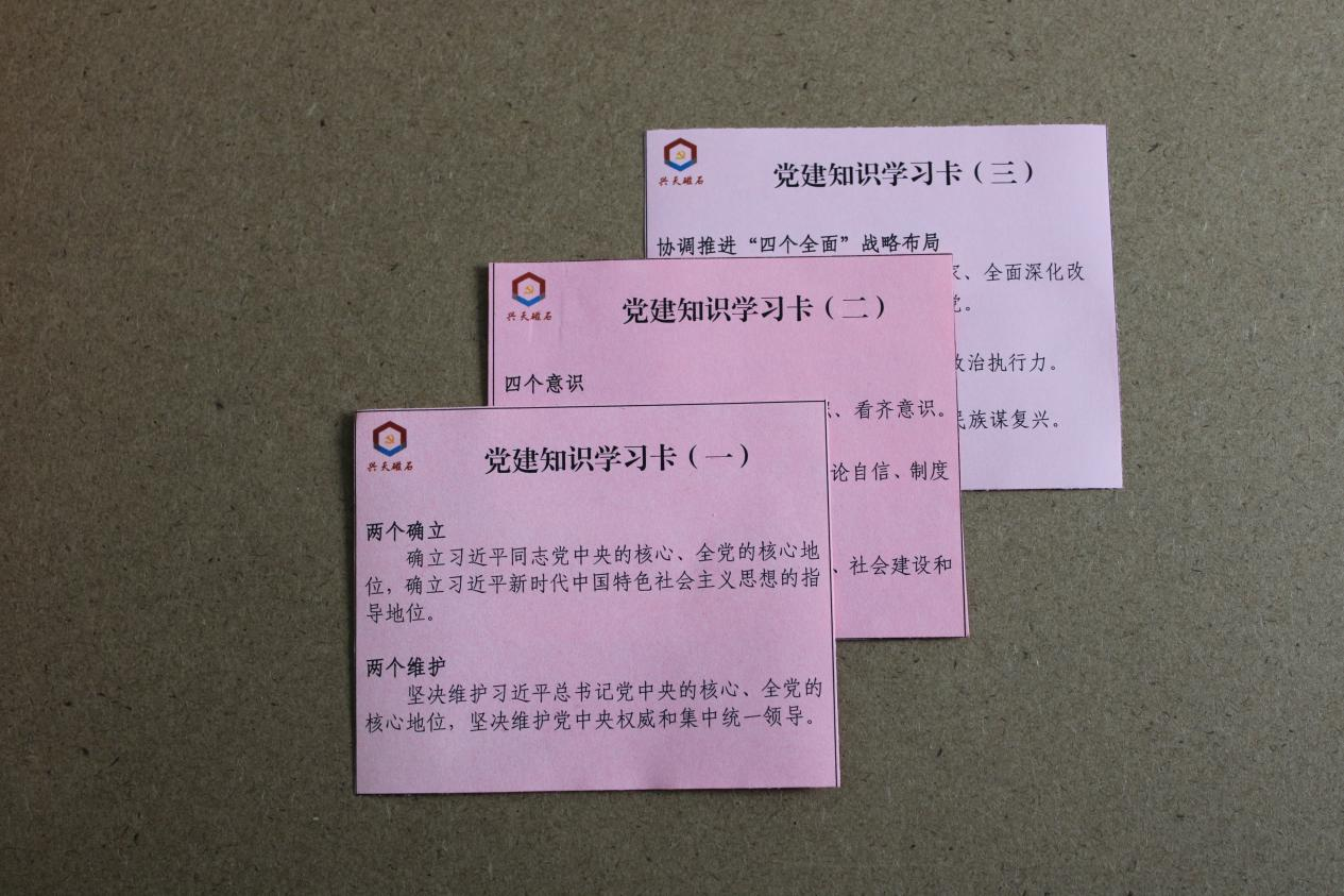 為深入學(xué)習(xí)貫徹習(xí)近平新時(shí)代中國特色社會(huì)主義思想,進(jìn)一步深化理論學(xué)習(xí),興天礦業(yè)黨支部積極創(chuàng)新形式,設(shè)計(jì)并印發(fā)“黨建知識學(xué)習(xí)卡”,切實(shí)提升學(xué)習(xí)實(shí)效。